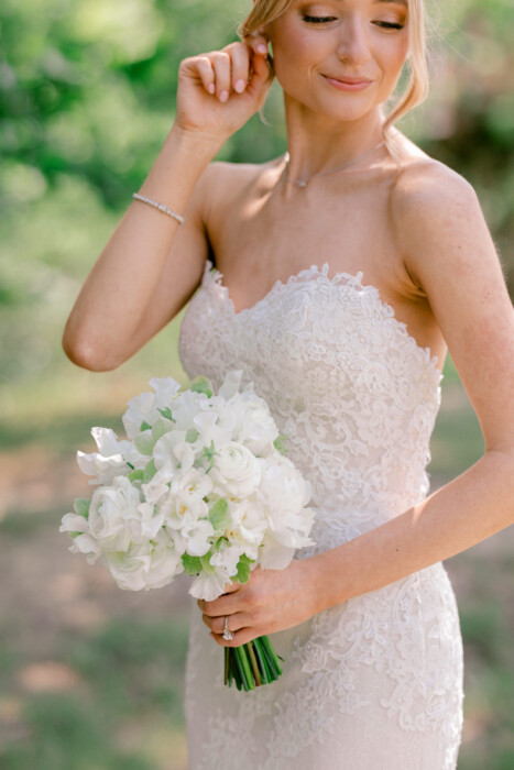 Lauren: I chose a lace-covered Pronovias wedding gown, which I paired with my mother’s diamond earrings. I wanted to look timeless, with hopes that I can look back on my wedding photos years down the line and still feel like myself. For the ceremony, I added a tulle overlay and cathedral veil to create a sense of separation between the ceremony and reception styles.
