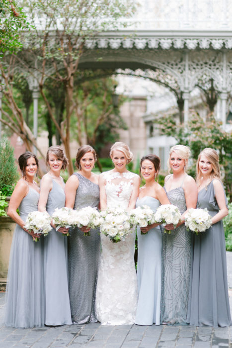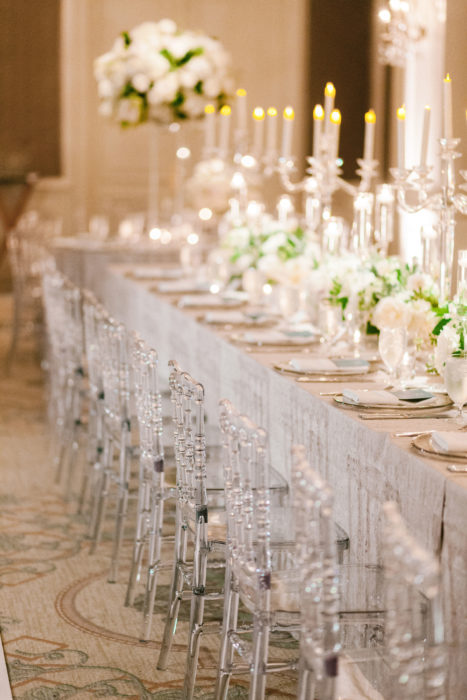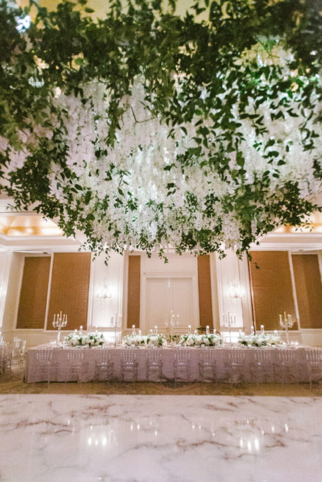 They balanced edgy acrylic chairs, candelabras, and a cake stand with more classic white and cream florals. The bridesmaids donned blue gowns, which inspired other decor and served as Rachel’s “something blue.” But out of everything, Rachel’s favorite decorative elements were the marble dance floor and overhanging floral ceiling treatment at the reception.