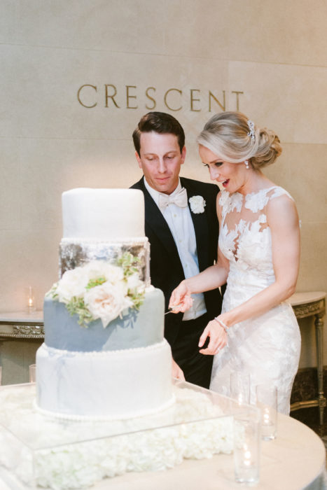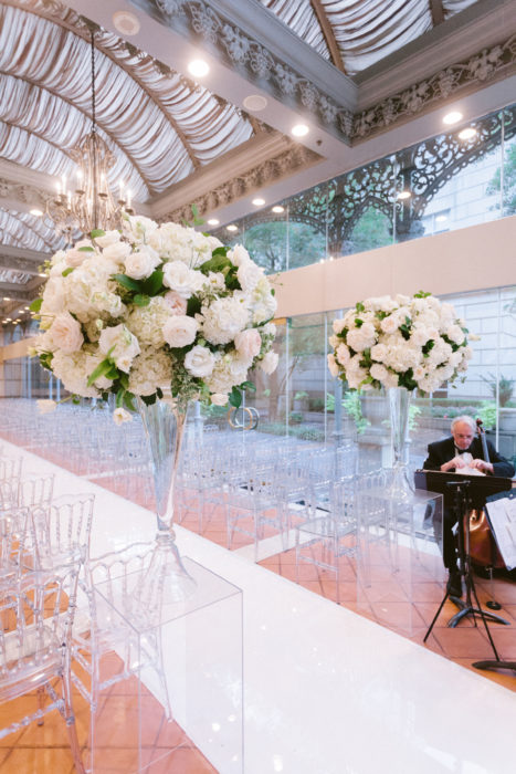 Rachel and Justin wed on October 13, 2018, at the Hotel Crescent Court in a ceremony that intertwined modern elegance with their personal heritage. “Justin is Jewish, so when it came time to choose the chuppah, we loved the idea of a lucite structure,” Rachel says. “That decision inspired our decor for the entire evening.”