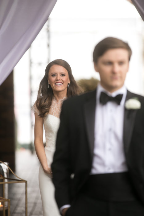 The bride-to-be began wedding planning with family close by her side. Sarah’s aunt, a consultant at Neiman Marcus Bridal, helped her say yes to a classic, cap-sleeved silhouette with lace details by Ramona Keveza. “Finding my dress was extra special with [my aunt] helping me,” remarked Sarah.
