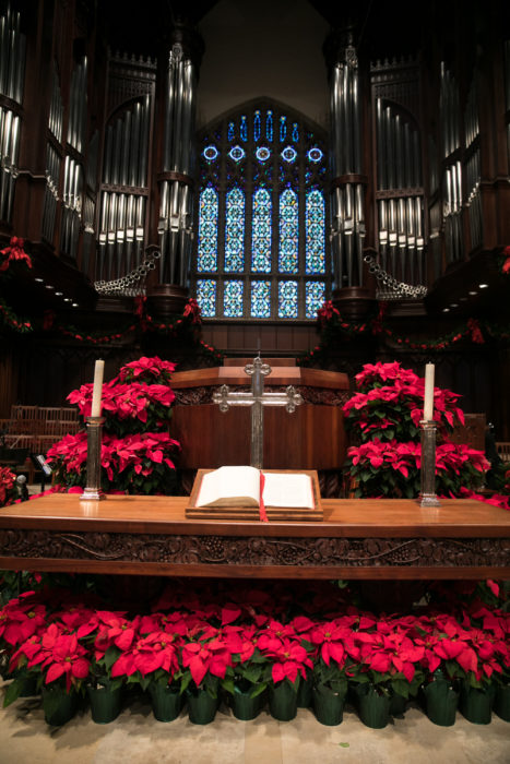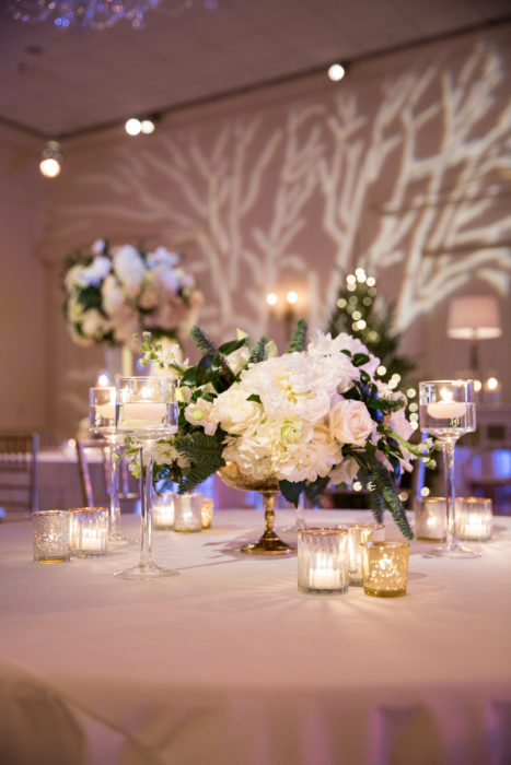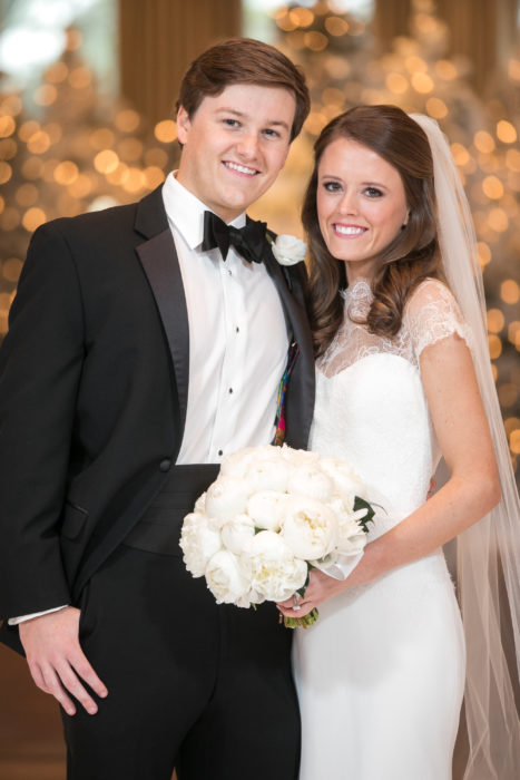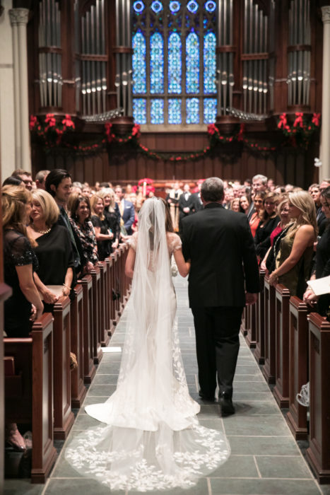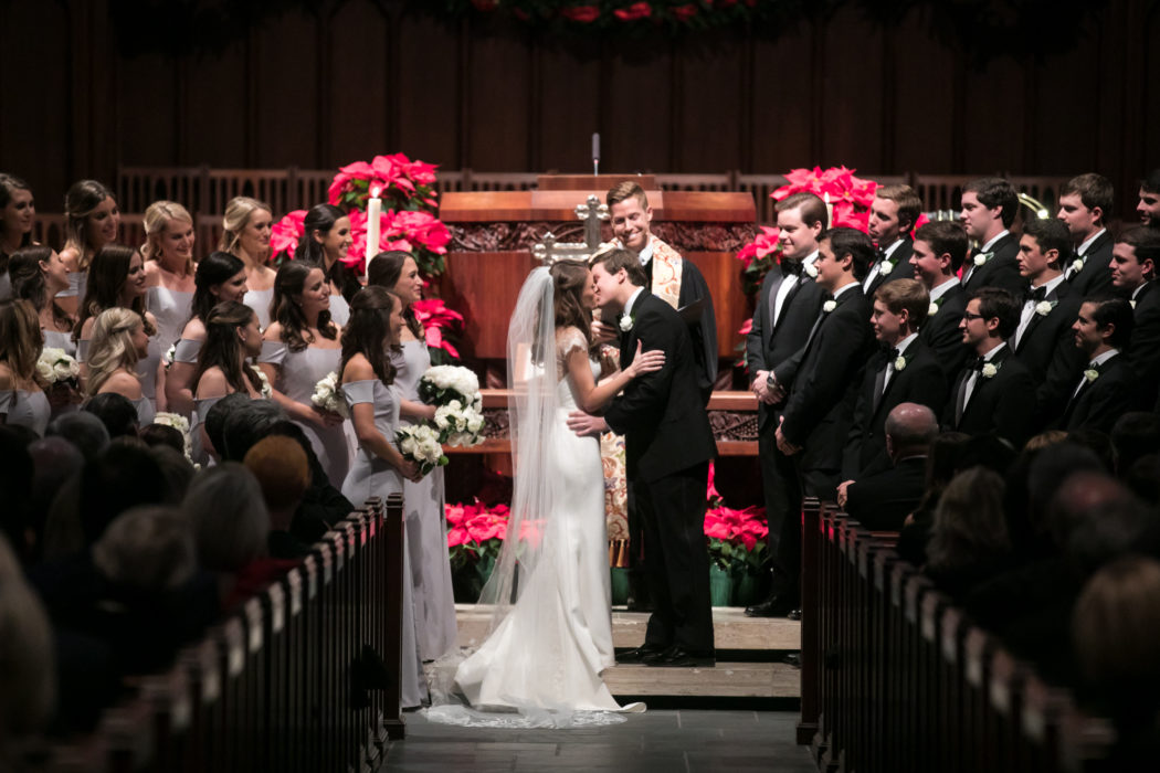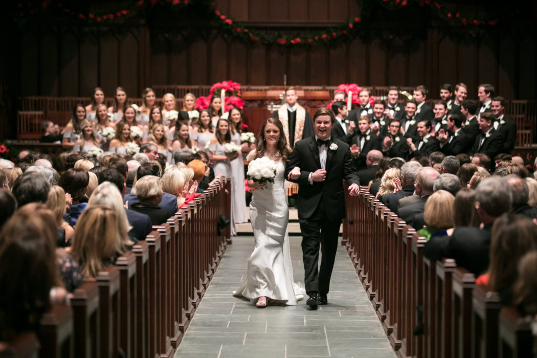 For as long as she could remember, Sarah had always dreamed of a winter wedding. “We went for a holiday feel with lots of Christmas trees, greenery, velvet, and twinkly Christmas lights,” says the bride. Sarah’s vision was brought to life at Highland Park United Methodist Church with poinsettias adorning the altar and garland hanging from the organ.