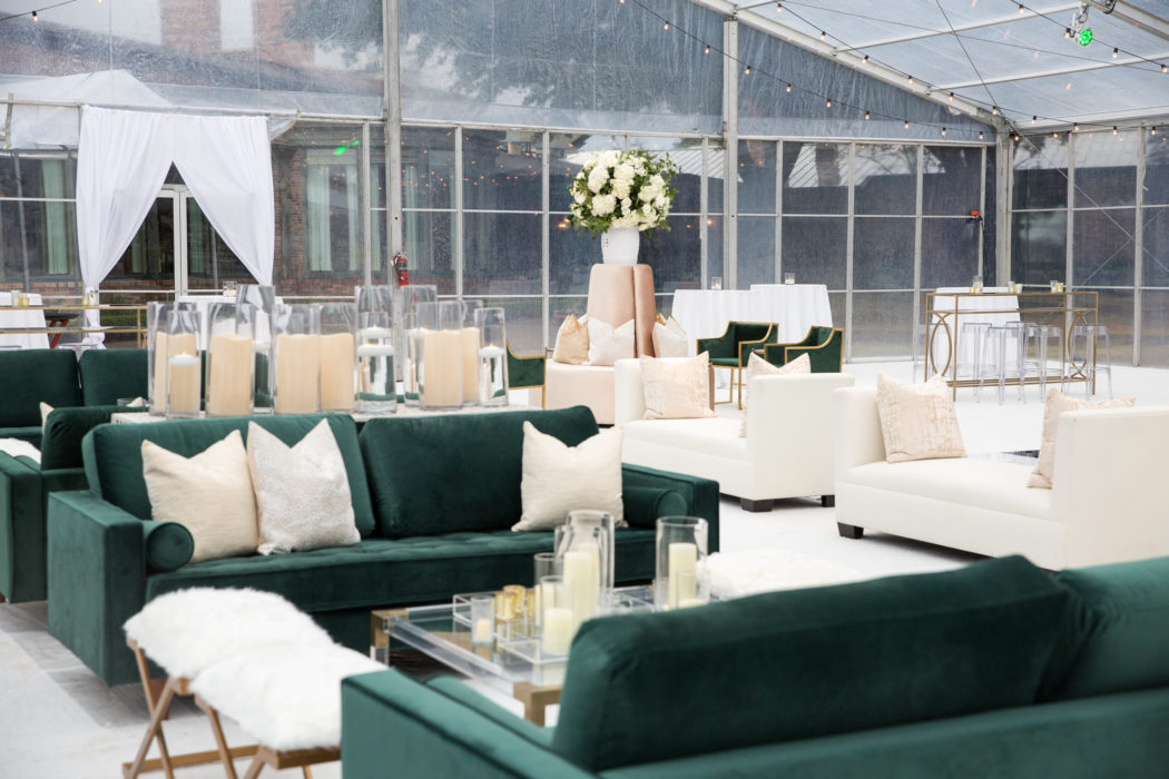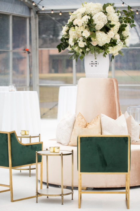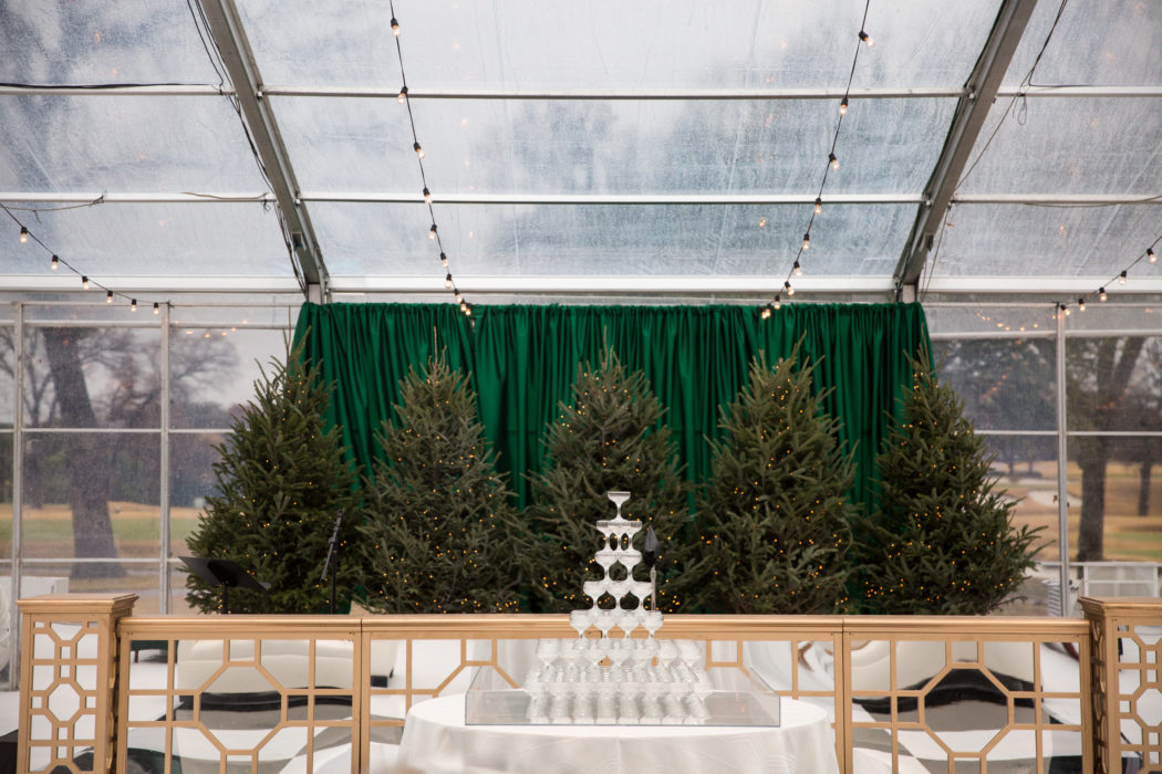 Following their late-afternoon ceremony, guests were escorted into a frosty-white tent for cocktail hour, which was adorned with Christmas trees along with emerald green and blush accents. Upon entering the tent, Sarah and Joseph poured a champagne tower to kick off their lively reception.