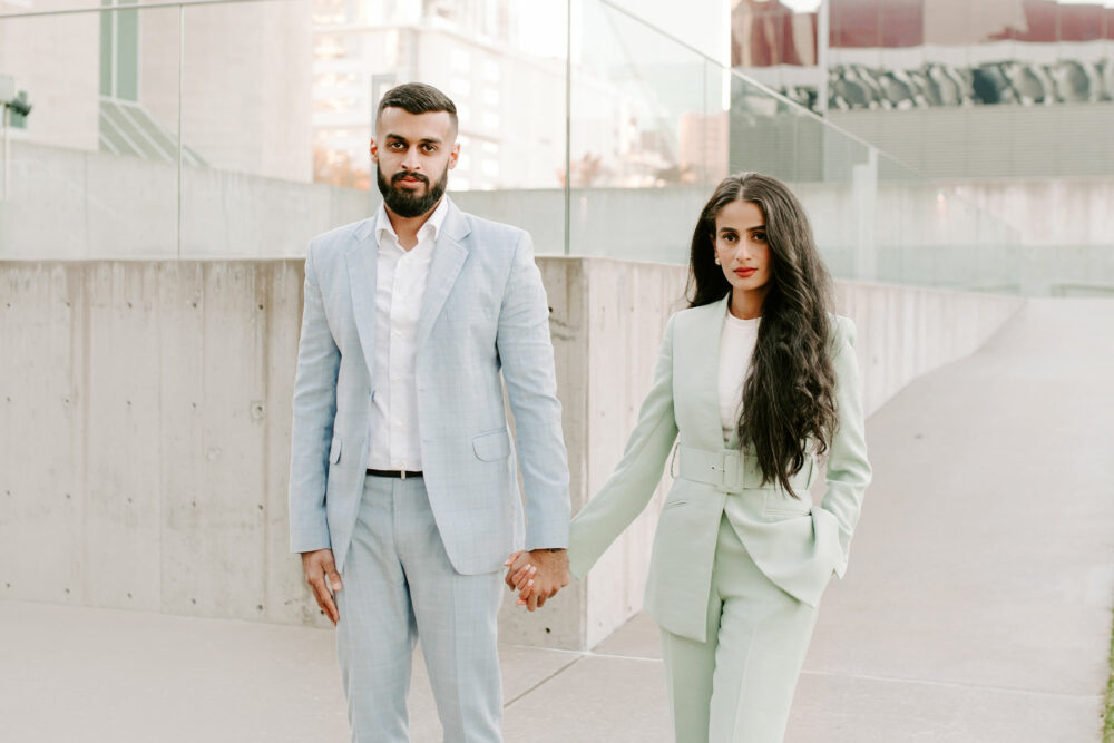 For Navdeep Sekhon Uppal and Prabhnoor Uppal, their families knew they would get together before the couple even entertained the idea. “Everyone always joked that we would end up getting married,” says Navdeep. Once the pair decided to give love a chance, she says, “everything kind of fell into place.” After two years of dating, Prabhnoor proposed. Prior to their April 2022 wedding, Navdeep was tasked with selecting outfits for their engagement photoshoot. Describing her personal style as timeless and modest, she naturally leaned toward a more tailored look. “I don’t really like to follow trends,” she says. “I know what looks good on my body and what I can and can’t pull off.” Her choice of a Zara mint green suit paired with pearl-embellished pumps from Dolce & Gabbana—plus Prabhnoor’s blue linen suit from Nordstrom—complemented the architectural surrounds of the Winspear Opera House location. Says Navdeep of the final look: “It was just perfect.”