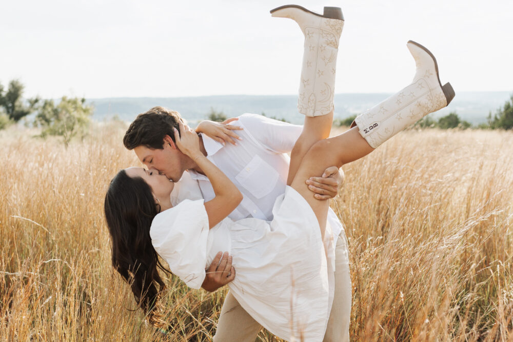 As an Austin native and a dual citizen, Merissa De Falcis is a little bit country—and a little bit Italian, too. So in planning her nuptials to college sweetheart Cole Bradford, she was torn between a wedding in Fredericksburg, Texas (one of the couple’s favorite weekend destinations) or a small celebration in Tuscany. Wanting a save-the-date option for either outcome, Merissa, herself a professional photographer, chose locations and looks that matched both vibes. For this shot, taken on the plains of Contigo Ranch in Fredericksburg, Merissa donned boots bearing her new initials—an engagement gift from her future in-laws. In the end, she and Cole hosted an intimate Italian ceremony, followed by a Dallas reception infused with a taste of Tuscany. “It was the best of both worlds!” says Merissa.
