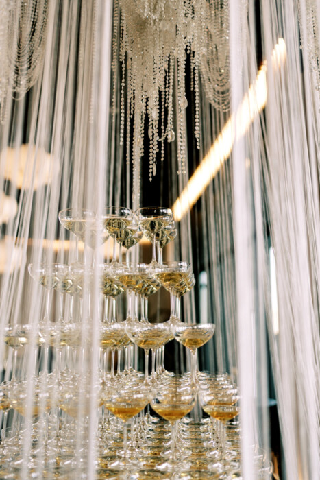 For the place settings, the GRO Designs team brought in custom table lamps with fringe detailing to add a swanky dinner-club feel to the room. “They made it feel like a speakeasy,” says Francesca. “It was absolutely perfect and exactly what we wanted.”