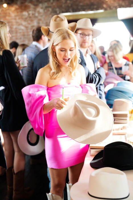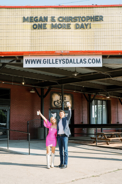 For their June 2022 wedding weekend, Dallas native Megan Riney and Austin-born Christopher Bybee wanted to pay homage to their Texas roots. Their Bent Tree Country Club reception was to be a black-tie-optional affair, so a kickoff party at Gilley’s Dallas would prove the perfect opportunity to infuse some Lone Star flavor. They tasked planner Allison MacNealy of Allison & Co. Events with planning a rehearsal dinner that was festive, fun, and a little bit country. She thoughtfully planned every detail—from the music (country tunes, courtesy of The Rustic Avenues) and the menu (barbecue and ranch waters) to an interactive hat bar, where guests designed cowboy style hats that doubled as favors. Remembers Megan fondly, “It was the best way to kick off the weekend.”