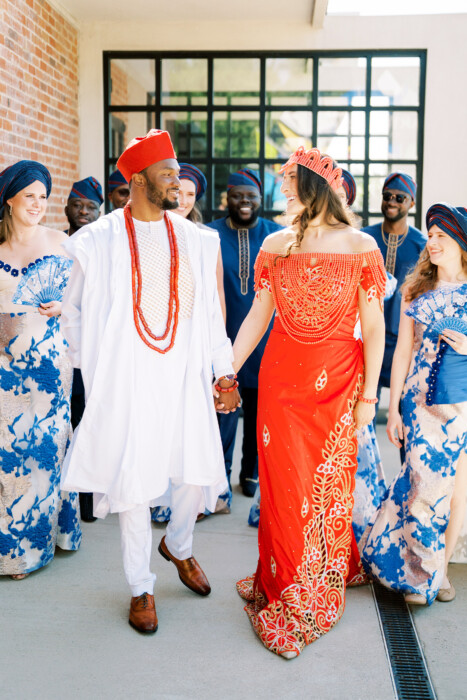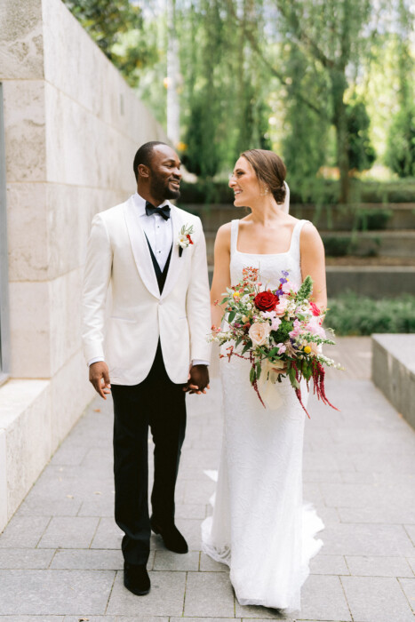 A mutual right swipe on a dating app led Katie Litman and Aziz Yakubu on a path that ended with “I do.” The couple worked together to determine the details that mattered most at the earliest stages of their engagement. “We knew that we wanted to incorporate traditions from both of our religions and cultures,” Katie says. The day before their wedding, the couple held a ceremony that blended Edo and Yoruba traditions, highlighting the Nigerian culture of the groom’s family, and they ended the night with a Shabbos rehearsal dinner to honor the bride’s Jewish beliefs. Although there were more than 200 guests in attendance, the new Mr. and Mrs. were still able to find moments alone. Says Katie: “Most of my favorite moments were when Aziz and I were able to sneak away and have time for ourselves.”
