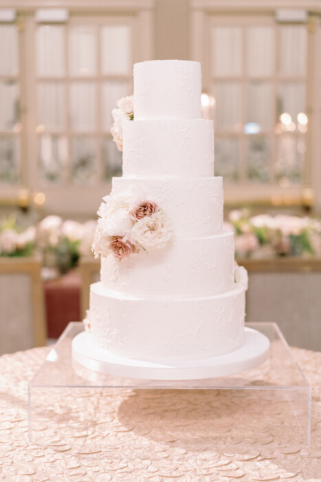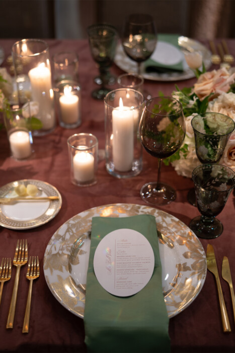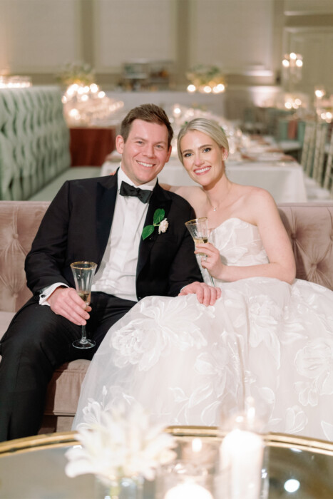 A few weeks before the wedding, planner Whitney Bailey found out that a larger ballroom was available at The Adolphus. So she snagged the bigger space and redesigned the whole floor plan. As a result, she was able to bring in more furniture pieces, like a comfy banquette in sage green. “Because the wedding was in the fall, we wanted to incorporate rich, darker tones,” she says.
