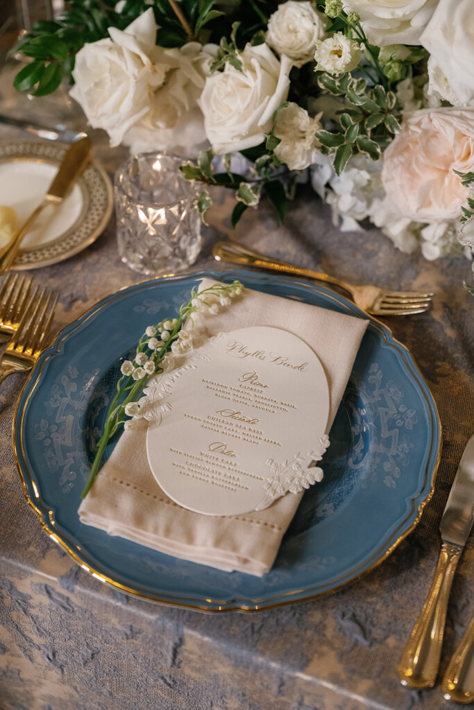 “We used sculpted embossing on the menu to add a tactile element, and the guest names were hand-calligraphied in gold ink. The menu shape was designed as an elegant oval, reminiscent of antique portrait silhouettes. It perfectly channels old-world romance and quiet luxury that feels both classic and deeply personal.”