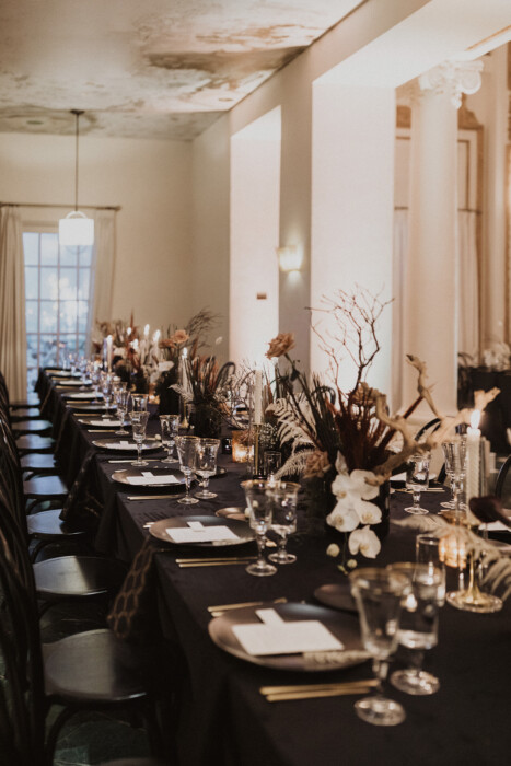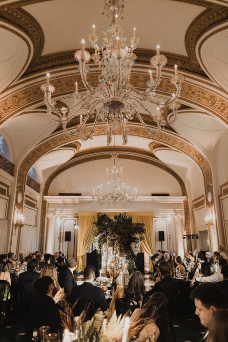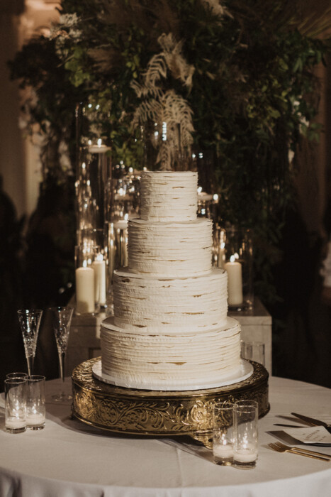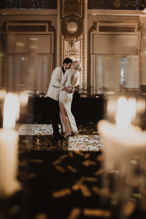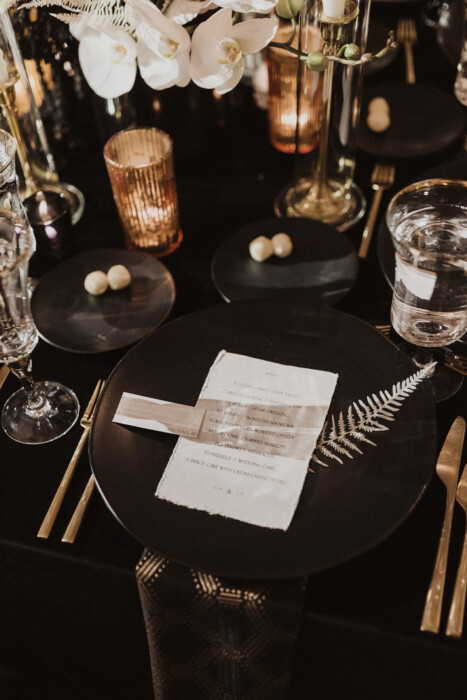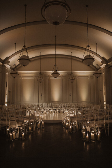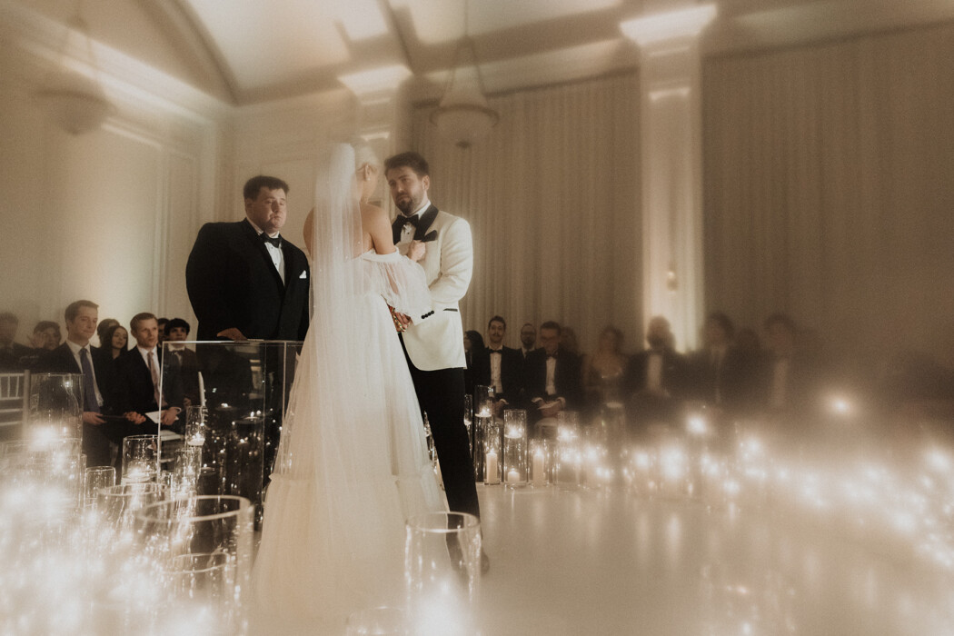 It was planner Jess Wegner’s idea to do the ceremony “in the round,” meaning that the guests and decor were centered around the couple, rather than having one long aisle. “When you walk in, it feels like you’re in this cocoon, or this bubble of love,” Jess says. Additionally, the bride much preferred candlelight to florals inside the ceremony location, which illuminated the space to create an atmospheric glow.
