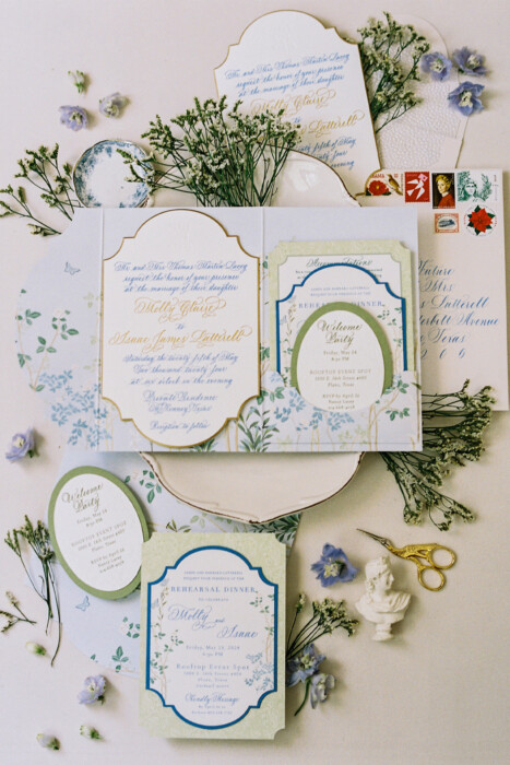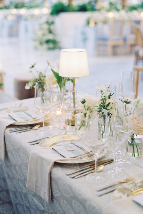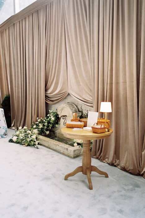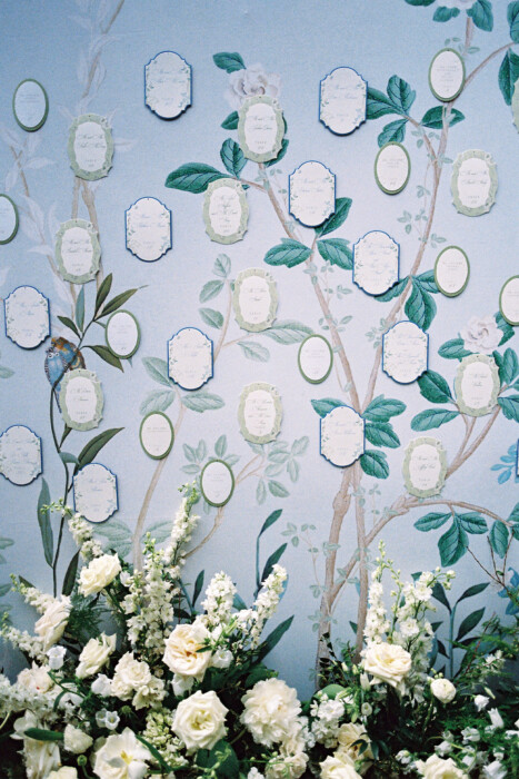 Nathan and Whitney joined forces to channel that energy and elegance into a backyard affair packed with personal touches like de Gournay wallpaper–inspired panels and linens, fountains filled with florals, an oyster station, a message-in-a-bottle experience, a multicourse dinner complete with sommeliers, and even some of Molly’s needlework. “This was the house where her parents brought her home from the hospital,” says Whitney. “That made it such a great experience.”