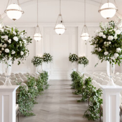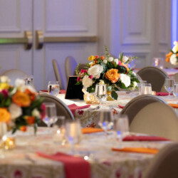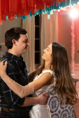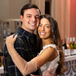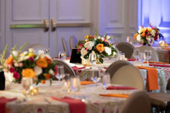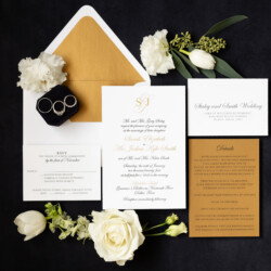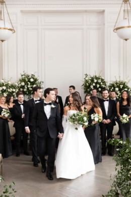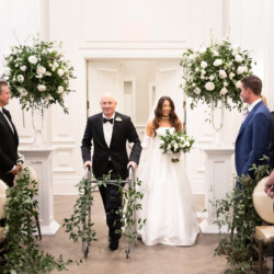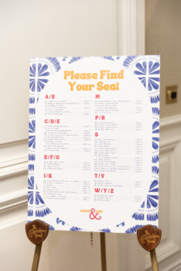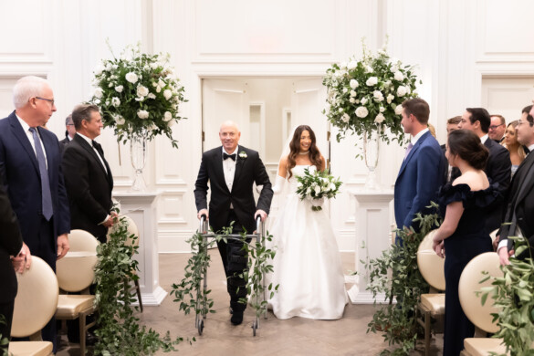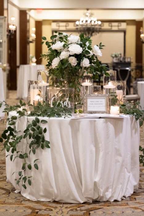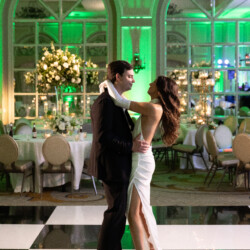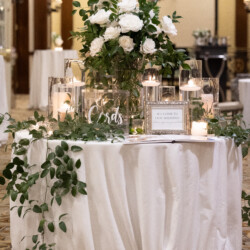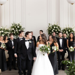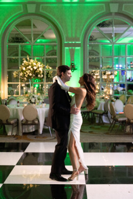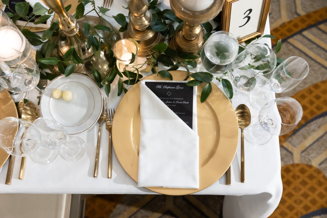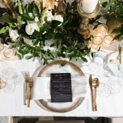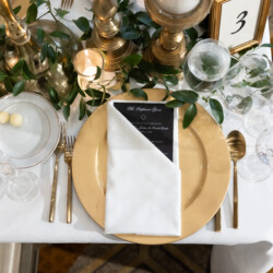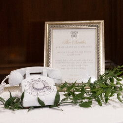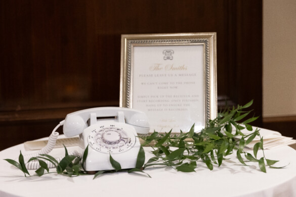 From the first design moment, Sarah wanted a black-and-white checkered dance floor with oodles of white flowers and lush greenery. The tables were decked out with gold tableware, glass chargers with gold rims, classic white table linens, and black linen personalized menus setting the tone for a classic, elegant celebration. One of Sarah’s favorite experiences was having guests leave a personalized message on a classic 1950s Princess phone!