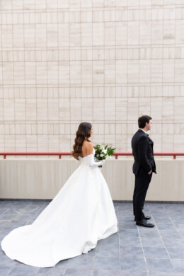 Wedding day morning, Josh and the guys played pool while the women were pampered getting their hair and makeup done! Photos began with a first look with the bridesmaids, followed by Sarah and her dad, and then Josh and Sarah had a private photo session all over the gorgeous Adolphus. Sarah was dressed in a beautiful silk Robert Bullock gown adorned with her grandmother’s pearl broach and opera-length gloves.