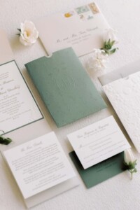 Sydney: For our invitation suite, we aimed for a very classic design complemented by intentional, high-end details. My mom, Lori, had the brilliant idea of incorporating the flowers from my dress into the invitations, such as on our save-the-date cards, which added a personal touch and a secret only we knew until after the wedding!