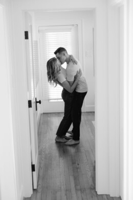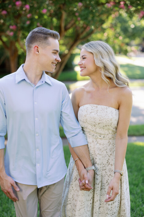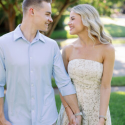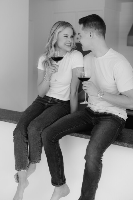 After Tristan Byram proposed to his girlfriend of three years, Emma Huels, they couldn’t wait to begin their life together. The first order of business was purchasing a home, which, they decided, would serve as the perfect place to take their engagement photos just weeks later. Though they hadn’t bought much in the way of furniture yet, the pair popped open a bottle of wine, consulted their growing vinyl collection, and laughed and danced their way through the session to the tune of a Dean Martin record. “We are so happy we are going to be able to look back at these photos in 10, 20, 50 years and reflect not only on the photos themselves but also on the house and all the happy memories we will have created while living here,” Emma says. The pair will wed on October 3, 2026, at The Adolphus Hotel.