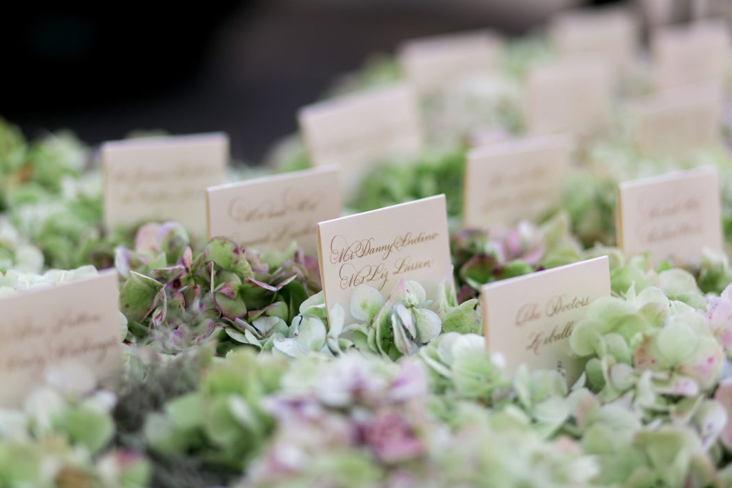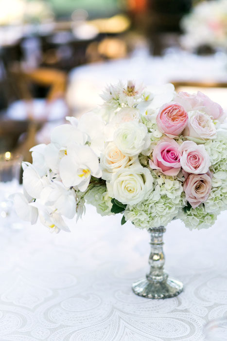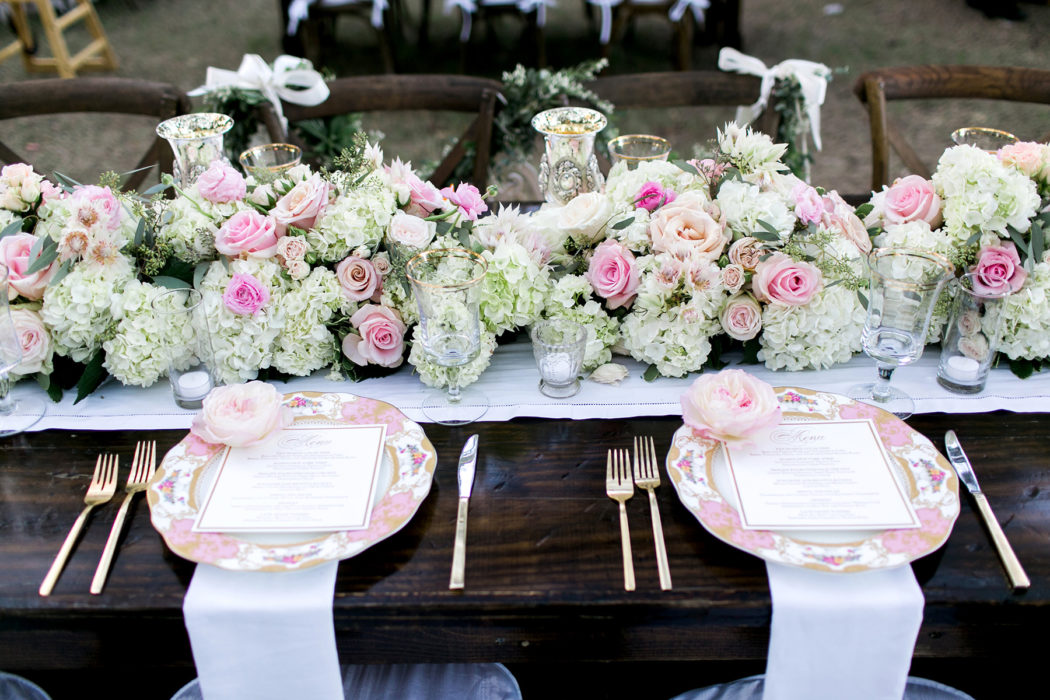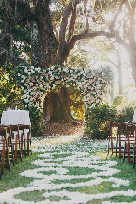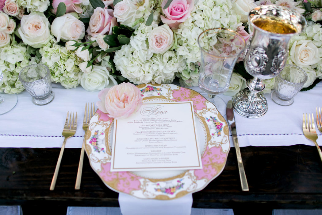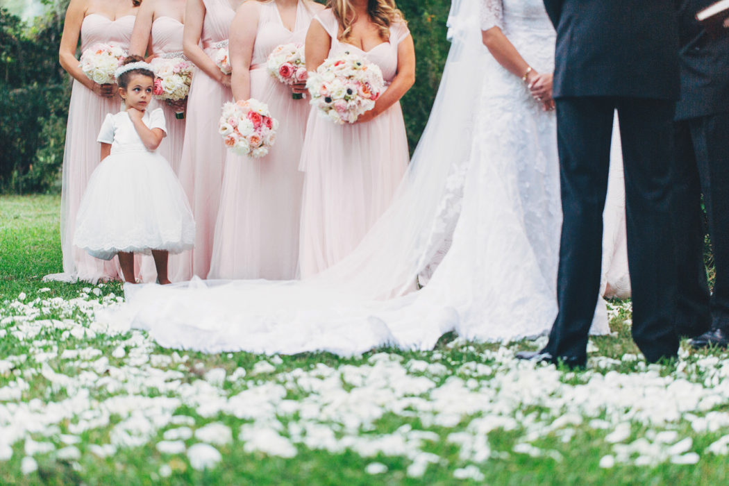 That was no matter for the pros, though. Krisi and her team built a walkway of flower petals to echo the already-lush floral arrangements in an elegant soft pink and gold color scheme.