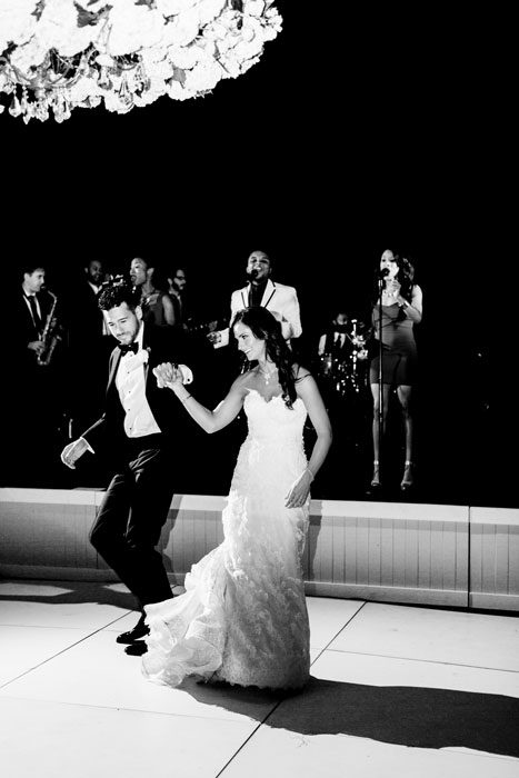Custom tambourines, surprise gospel singers, a string quartet, crystal chandeliers, and even a greenery-draped swing rounded out the dreamy setting.
