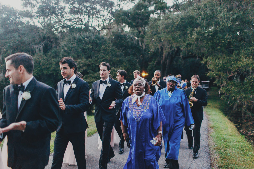 Custom tambourines, surprise gospel singers, a string quartet, crystal chandeliers, and even a greenery-draped swing rounded out the dreamy setting. Guests followed a walkway of lanterns from the cocktail hour to the reception and enjoyed small plates on mixed pieces of Southern china, and any prior concerns over weather rolled out with the tide for Taylor and Munear’s sunset nuptials under the trees