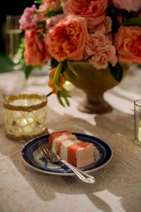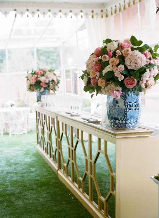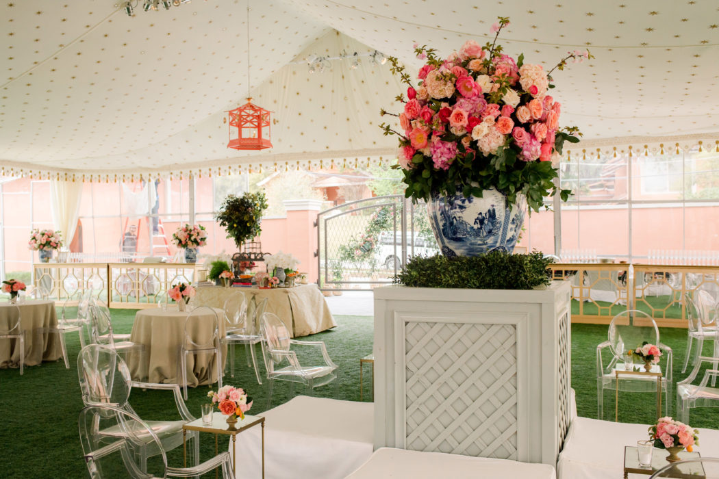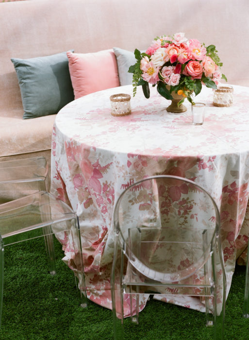 “We tried to look at each angle like you would decorate a home—each section is a vignette,” says Sara Fay. That starts with personalization. “I always like to really get to know the couple and their style. It doesn’t happen in a day.” For Taylor and Alex, that meant incorporating the bride’s favorite color—coral—which was already featured as the Mansion’s backdrop.