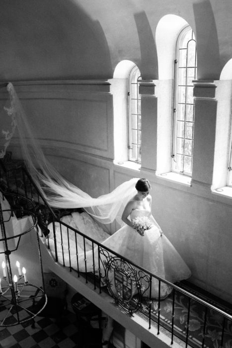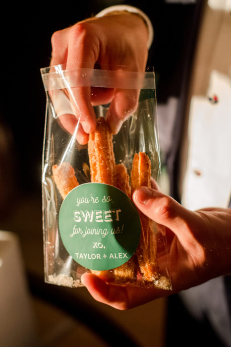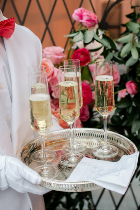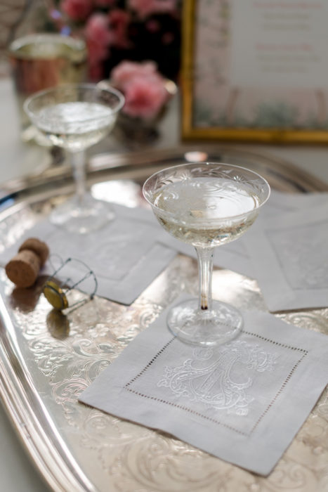 The coupe glasses were used for all guests—not just the toasting couple. The retro-looking glass was used to serve the bride’s signature cocktail, a peach bellini. The “groom’s favorite” was a cocktail featuring whiskey. Drinks were also served with custom, handstitched cocktail napkins—500 of them embroidered with the couple’s new monogram. “I have all of those now,” says the bride, an ever-ready hostess.