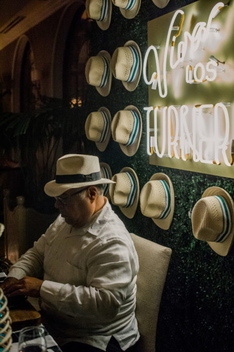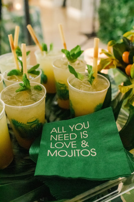 Mojitos were ready to welcome guests into the after-party, along with hats with green and white rib- bons and boas. “We had lots of festive little Cuban-themed party items to hint at what was to come in the after-party,” says Taylor. The after-party also included a churro cart and another addition by Sara Fay—tacos with stickers that read: “Let’s Taco ’Bout That Wedding.” “We wanted a party you could’ve found in New York in the 1950s, with the black and white and the palms.”