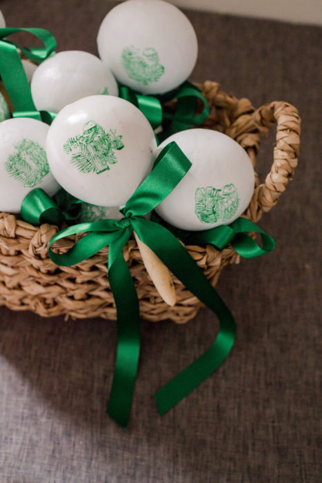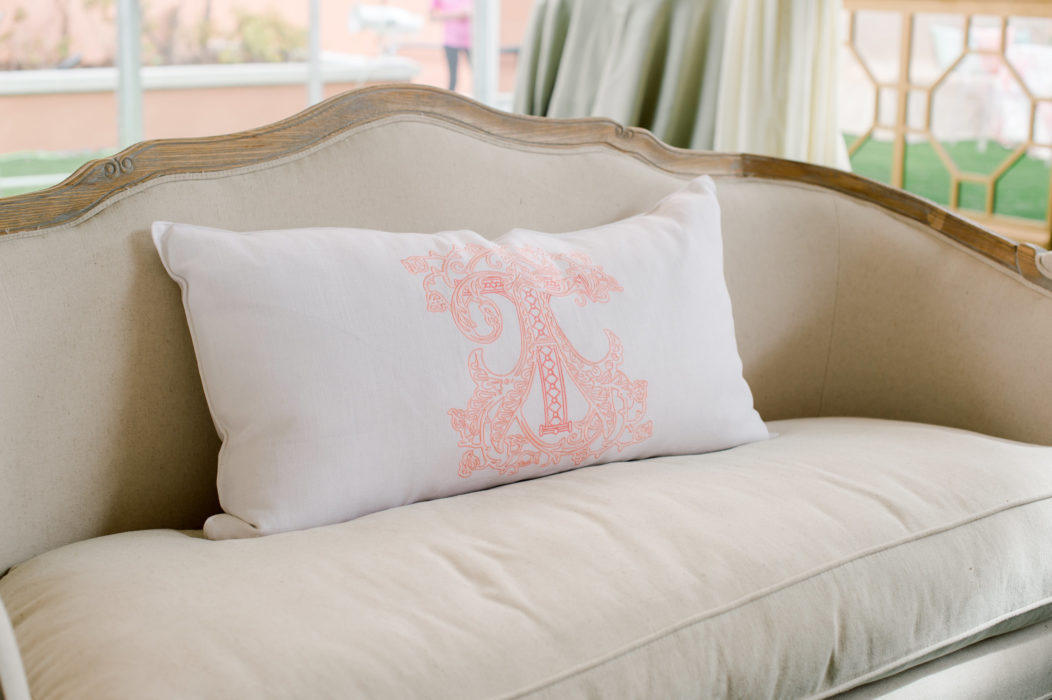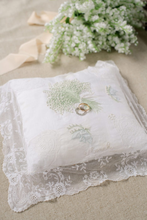 Taylor already knew that lily of the valley was going to be an important design element throughout her wedding. So she found an artist in the South who designed the floral pattern by hand. But the personal touches didn’t stop there. “My [great-grandmother’s] handkerchief was stitched on top of the pillow,” says Taylor. “Along with the lovebirds, the lily of the valley, and our date.”