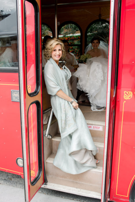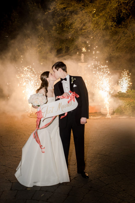 To create a secondary portion of the reception and make it feel like a separate experience, the bride and groom envisioned an after-party inspired by one of their favorite trips to Cuba. This part of the night was held in the Mansion’s ballroom. “We initially were supposed to drive my grandfather’s old convertible, but it wasn’t working, so we compromised and led a second line from the tent to where we had fireworks going off, and then to the ballroom,” says Taylor.