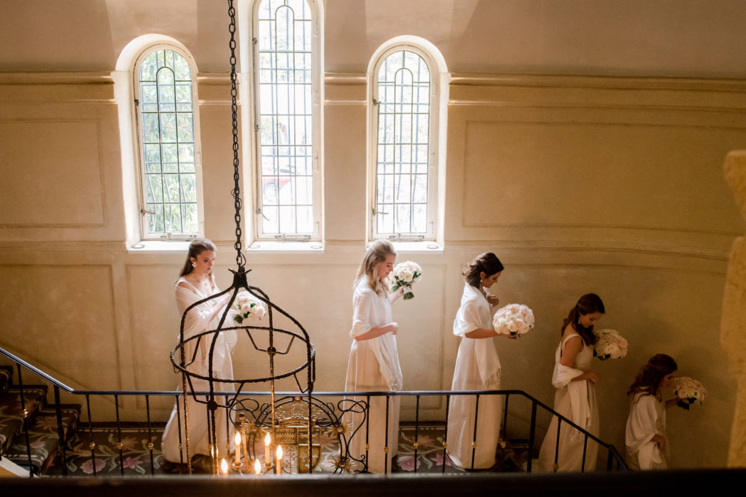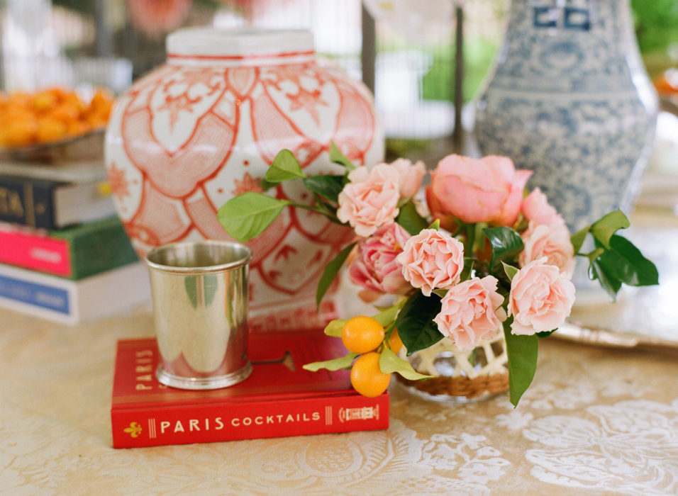 Then came the details: two lovebirds in a birdcage; the lemon-and-chinoiserie envelope liners inspired by Gracie panels; a quatrefoil entry table with Brunschwig & Fils linen; and silver from the bride’s mother and grandmother, including the bride’s engraved christening cup. “Don’t look at Pinterest or your friend’s wedding,” says Sara Fay. “Look at your home. The best homes are the ones that you walk in and feel like things have been gathered and curated over time.”