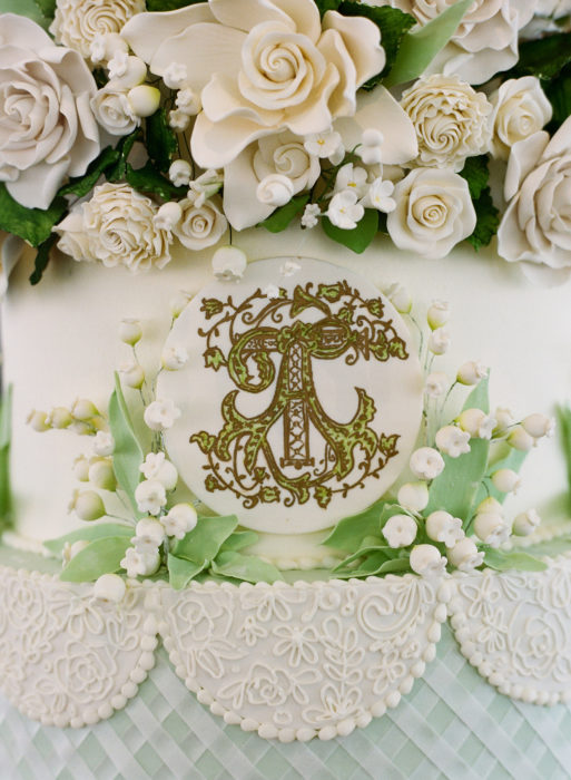 During her season of wedding planning, the bride found herself sitting in an airport, thinking about her upcoming meeting with Panini Bakery. She knew what she wanted, layer by layer: green, then lace that mimicked her dress, then lily of the valley. “I wanted it to be like a little garden,” she says. “They did a phenomenal job.” (And, of course, the topper featured a pair of lovebirds.)