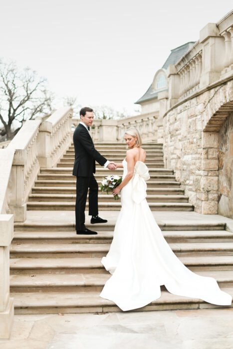 Patience is a virtue that Daniel Gillespie knows all too well. After he spent more than a year pursuing Taylor Mitchell through a mutual friend, she finally responded to an Instagram story he posted of himself playing tennis. A group tennis date turned into an all-day affair, culminating in a late-night dinner at Javier’s. It was there that Taylor realized why her best friend had been so insistent on setting them up, and the two quickly became inseparable. On February 22, 2020, in perfectly crisp, late-winter weather, Taylor and Daniel said “I do” in front of 250 of their nearest and dearest. The bride, wearing Sareh Nouri, donned a garter worn by both her mother and grandmother at their weddings. After hours of celebrating and dancing to the music of In10City, the newly minted husband and wife shared a private last dance to Ellie Goulding’s rendition of “Sweet Disposition,” their favorite song.