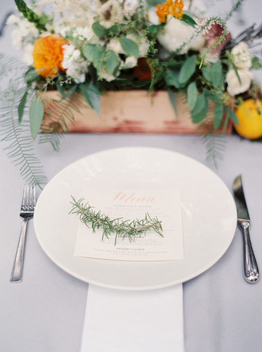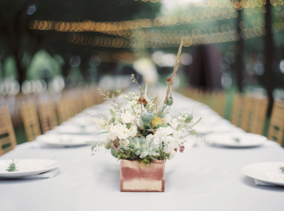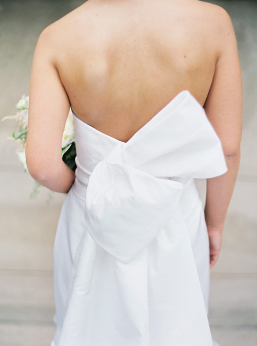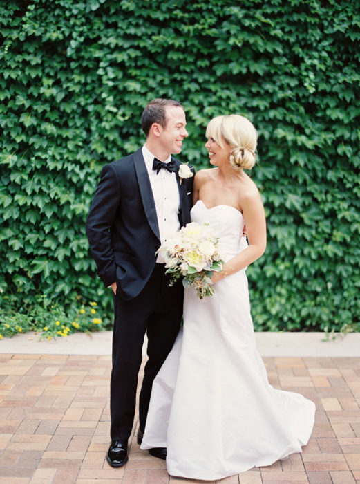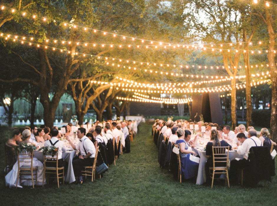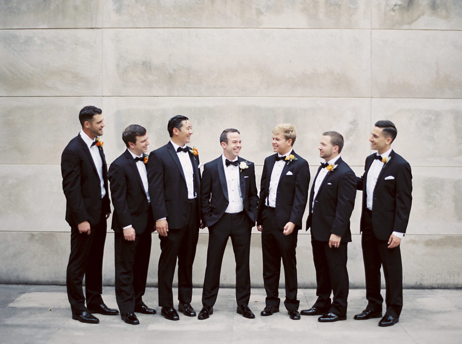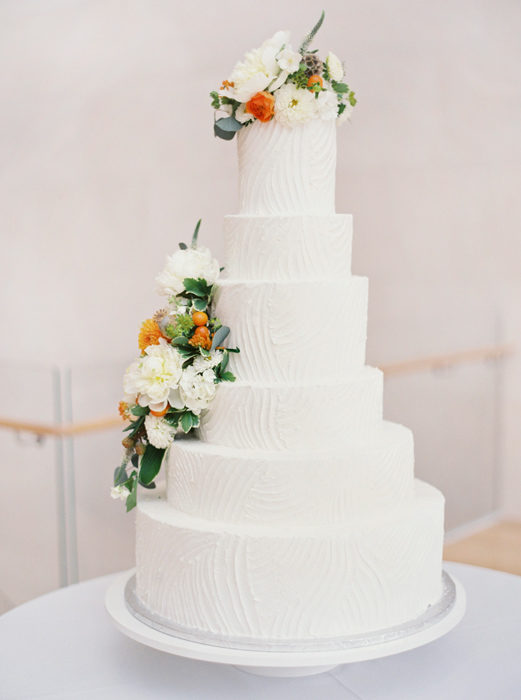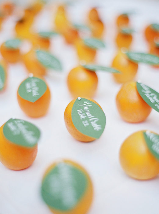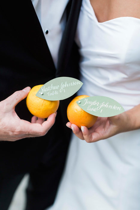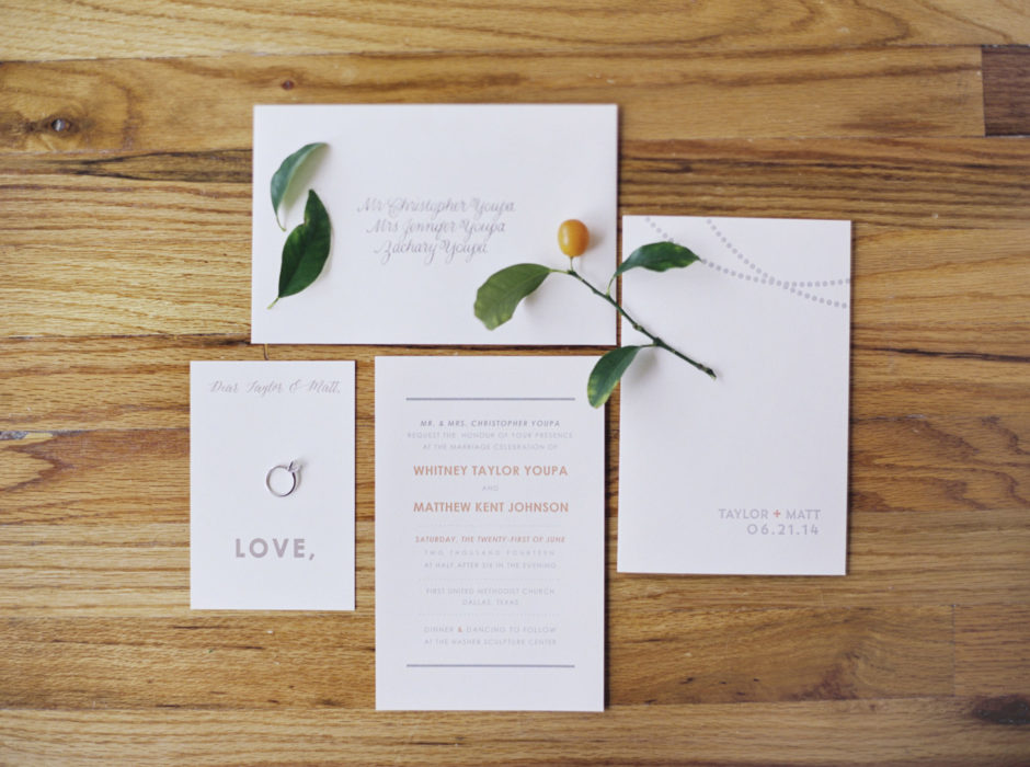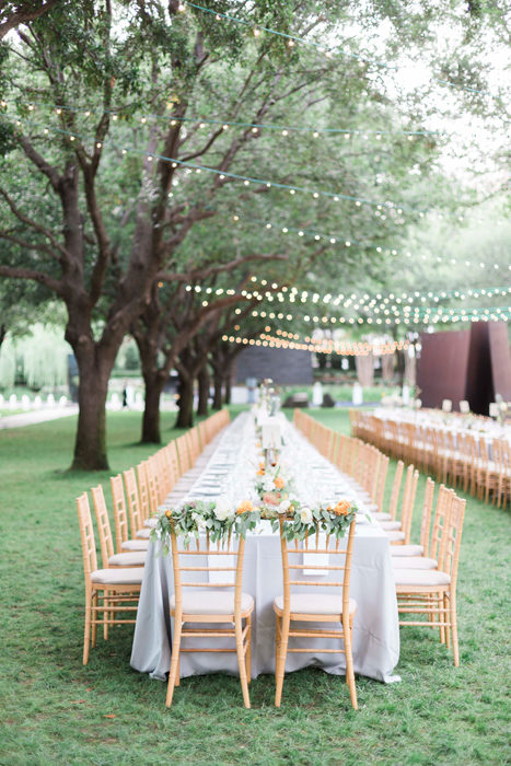 For their ceremony, the bride quickly decided on First United Methodist Church, where her parents got married. For the reception, the art-history major chose the Nasher Sculpture Center. She chose a white color scheme and added pops of summery orange—Matt’s favorite color—with citrus.