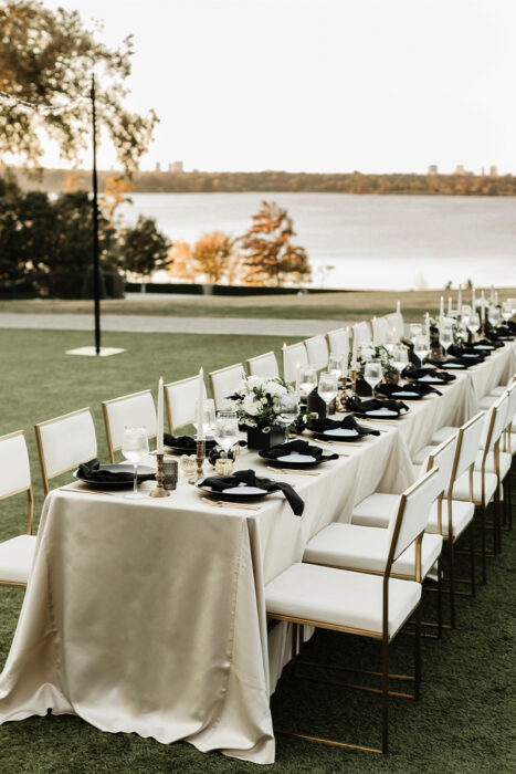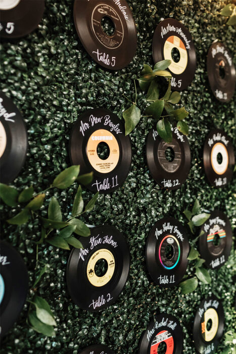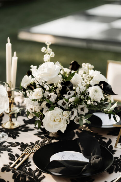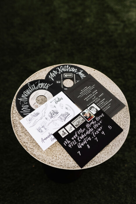 The black-and-white color palette was a non-comprisable aspect for Amanda. “I wanted to make it so simple and classic, so I could look back on my photos and still have it look good,” Amanda says. Black chargers topped with white round menu cards were designed to resemble a record.