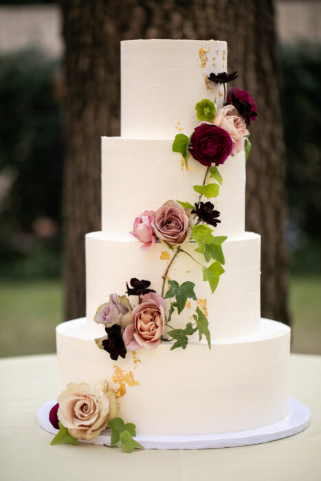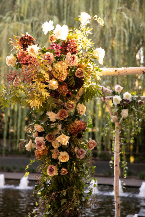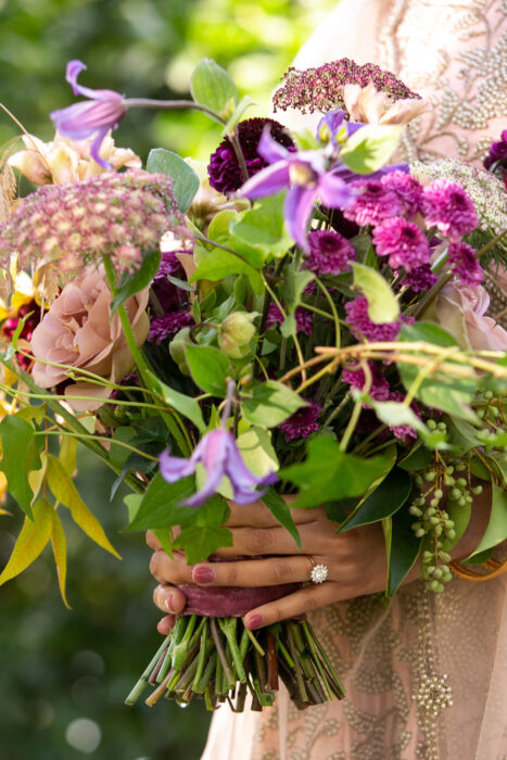 The pair married under what’s known as a chuppah in Judaism and a mandap in Indian tradition. The number seven—sanctified in both cultures—was incorporated through the Jewish tradition of Hakafot (circling each other seven times to provide protection) and the Indian ritual of Saptapadi (taking seven steps, each representing a sacred vow). Finally, they placed floral garlands around one another’s necks in an Indian ceremony called Jai Mala, while Garrett’s mother wrapped them in a tallit, a prayer shawl that symbolizes the love surrounding the new couple.