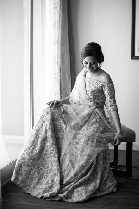 One of Nemi’s top priorities when planning her wedding was finding a way to incorporate customs from both her and Garrett’s backgrounds. In the midst of a 24-hour on-call shift, the busy bride-to-be began researching Jewish and Indian wedding traditions—and found a number of similarities. “I liked the idea of combining our cultures in a way that highlighted the parts that were similar,” she says. “I designed the ceremony to take the rituals from both cultures’ weddings that echoed the same themes.”