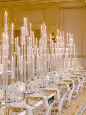 Some people say less is more. Those people are not our people. This tablescape from Nicole Underwood and Reza Koranki’s wedding, held on November 4, 2021 at Gaillardia Country Club in Oklahoma City, Oklahoma, demonstrates the power of committing to a hero element—in this case, the dramatic glass candleabras from Bella Flora of Dallas presented en masse. At the reception—designed by Bella Flora and OKC-based Aisle Be With You—the Bella Acento mirrored head table reflects the warm light and further enhances the effect. Low floral arrangements and additional candles—both by Bella Flora—provide fullness but don’t overpower.