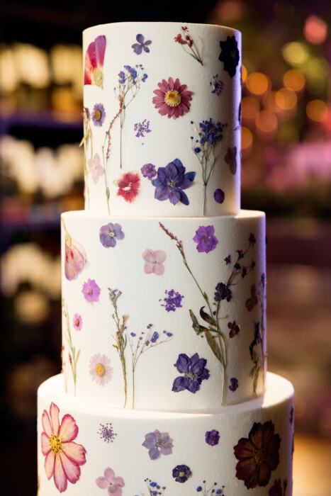 Flowers are nothing new in the wedding world, but modern brides are thinking outside the bouquet. At Carol Alban and Mark Diaz-Arrastia’s “I do’s”, floral details appeared everywhere from the bride’s veil to the cake—made by Fancy Cakes by Lauren—which bore edible, freeze-pressed blooms.