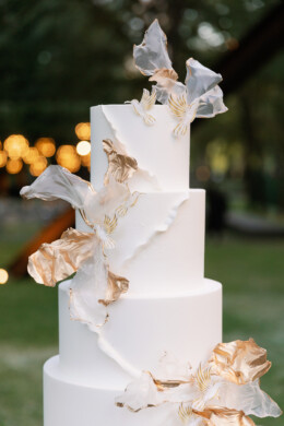 Many a bride have donned flirty ruffles on their big day, but now desserts are getting in on the fun! This Fancy Cakes by Lauren–created confection is adorned with rice-paper ruffles painted with edible gold leaf—giving it a romantic sense of movement and sculptural whimsy we just adore.