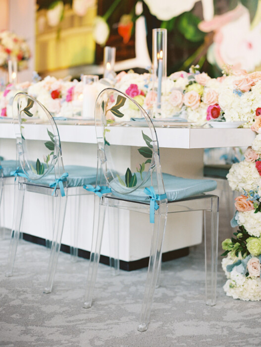 Don’t settle for cookie-cutter decor! Every surface is an opportunity to add your own flair. Take, for instance, the leaf-accented ghost chairs (decals designed by Pop Parties, executed by Shag Carpet); botanical bandstands (designed by Katherine Jezek Designs in partnership with Pop Parties); and custom dance floor and stage wrap (designed by Color Box Letterpress, created by Center Stage Floors) below.