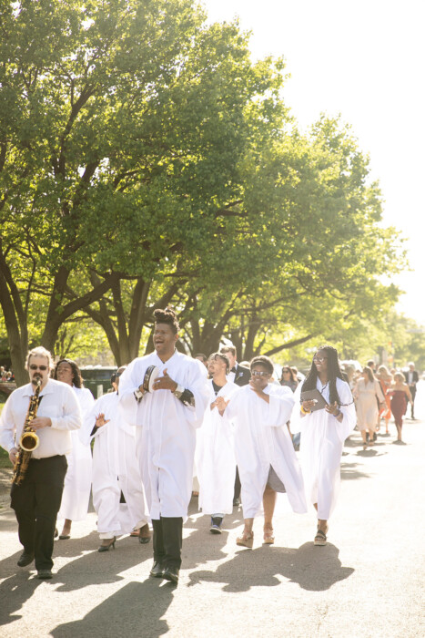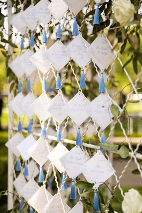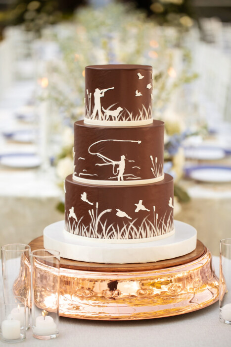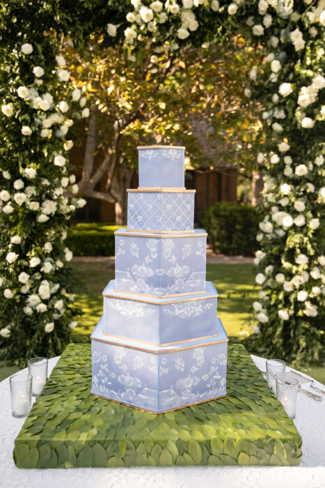 The couple wed in the church connected to their childhood school. Following the ceremony, guests walked a block to the reception site: the home of Peyton’s paternal grandmother and namesake. The home also inspired the design of the dance floor, which borrowed a pattern from the dining room’s ceiling. “We had lots of celebrations and family dinners under that ceiling growing up,” explains Peyton of the choice.