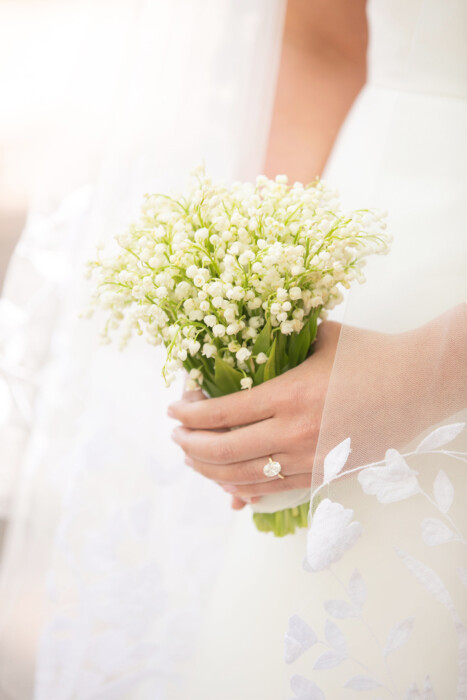 Peyton had two bouquets made for the day of the wedding so she could make a gametime decision—one, a larger arrangement, and the other, a small spray of lily of the valley. “I liked the simplicity of it with the veil and the overall look,” she says. “It has that classic air about it.”