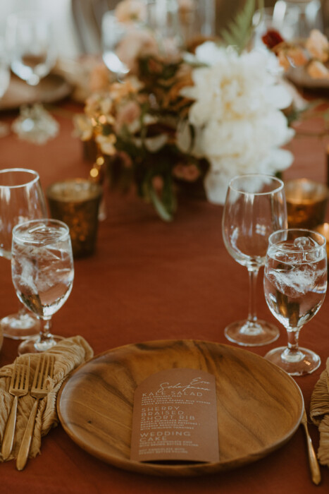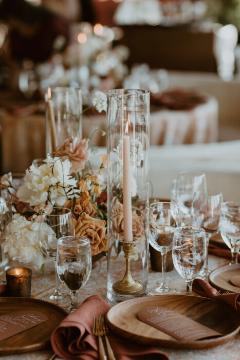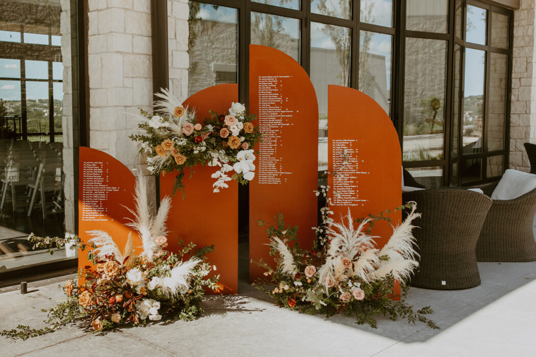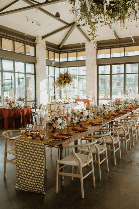 “To achieve the “little bit Bohemian but not over-the-top” aesthetic Allie wanted, Jess sourced just-right rental pieces (even going so far as to borrow basket pendants from Stems Floral’s Austin studio, which were uninstalled for the occasion and reinstalled afterward). She also worked with florist Abby Daigle to incorporate orchids into arrangements—the refined feel of which, Jess says, “kept it from leaning too boho and made it more formal.”