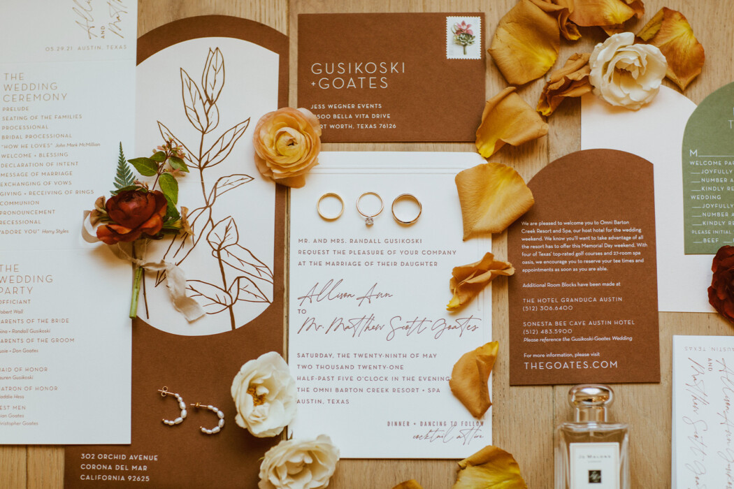 For Matt Goates, catching Allie Gusikoski off guard for a proposal was no small feat. “I always had suspicions,” she says. But with the help of distractions from friends and family, and her California relatives sneakily flying in early for Thanksgiving, Matt was able to say “I gotcha” before dropping to one knee on November 20, 2020. Six months later, the pair sealed the deal at their modern-boho wedding that celebrated Southern beauty and charm against the backdrop of Austin’s captivating Hill Country—an ode to the state that brought them together.