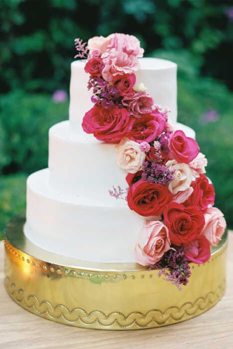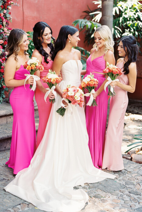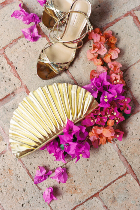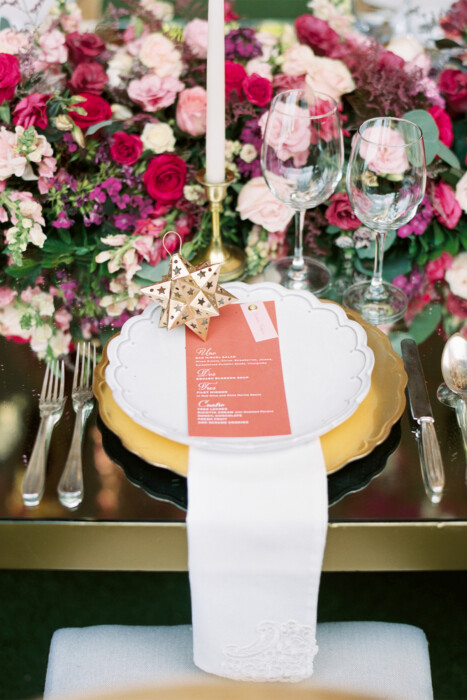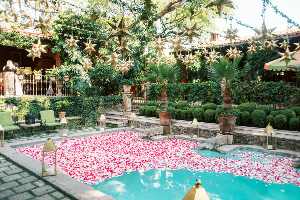 Alexis was inspired by the native flowers that bloom all over San Miguel. “I wanted to emphasize the bougainvillea colors so that it felt like an extension of the florals that are already naturally planted there,” she says. Lush runners of roses lined the tables, and an installation of brass stars and flowers covered the tent’s ceiling.