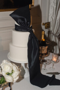 The elegant cake, designed by Fancy Cakes by Lauren, featured pearl details and a dramatic black bow, paying homage to Cassie’s wedding gown.
