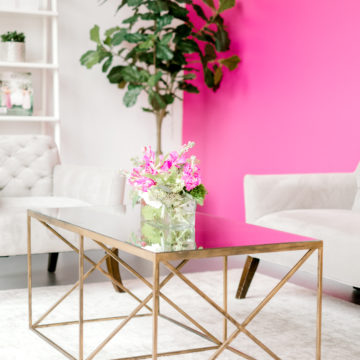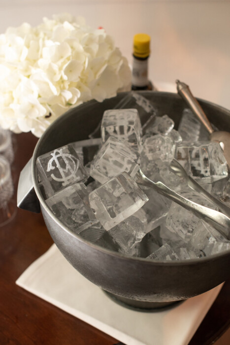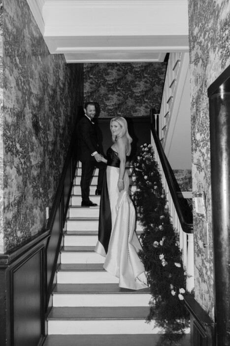 After trying on many gowns and having no luck, Cassie finally found “the one” at Bergdorf Goodman in New York City. “I’m always in black, so when I walked into Bergdorf’s, I found this Marchesa dress with a black bodice and an architectural grand bow, and it felt elegant and elevated and perfect for New Year’s Eve,” she says. She added pearl details to the train, which was a sweet wink to a phrase the couple often say to one another: “The world is your oyster, and you are my pearl.”