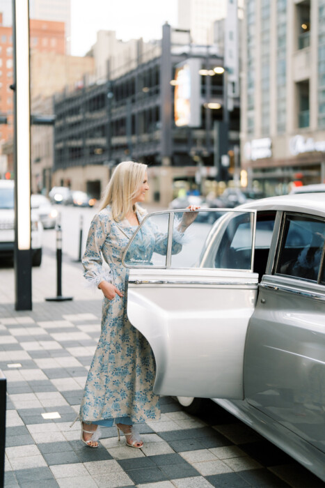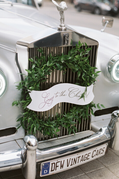 Rather than depart with a grand exit, the couple made separate dramatic entrances in a 1957 Rolls Royce. The bride wore a vintage Dior robe with custom feather accents for her arrival. “I loved the idea of a grand dame in her marabou robe coming down the staircase,” she says.