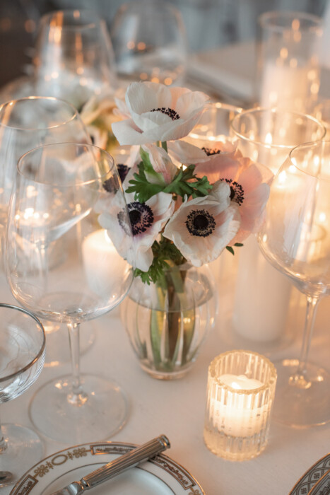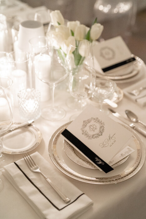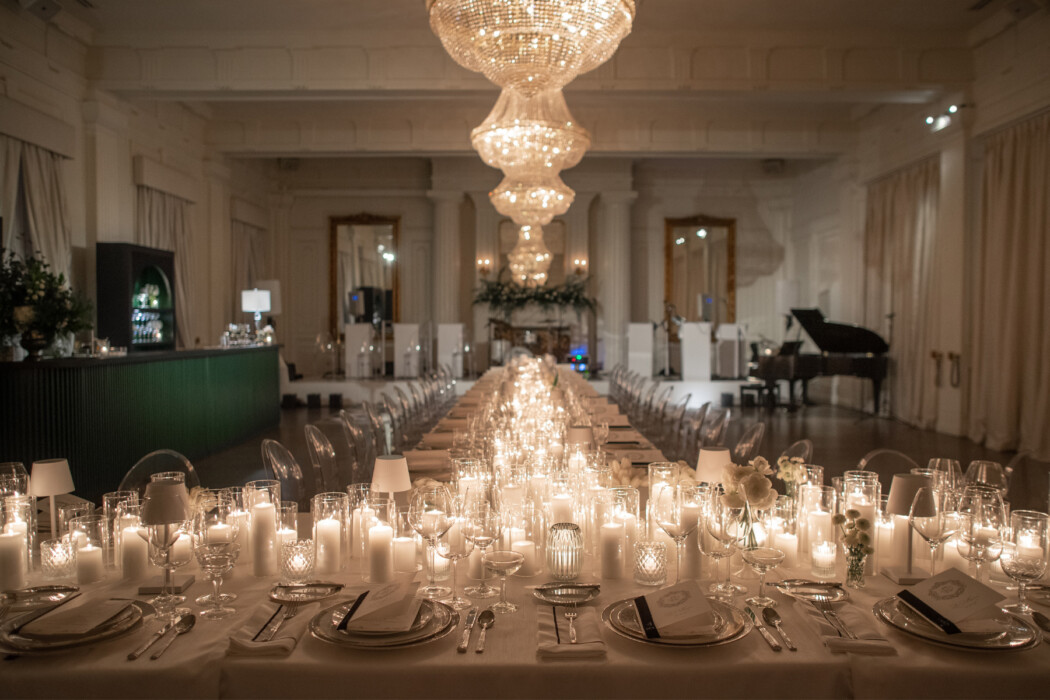 At the supper club–style reception, guests dined on a four-course, French-inspired meal, surrounded by twinkling candlelight. “We were able to sit everyone at one long table,” says planner Julian Leaver. “It was spectacular.”