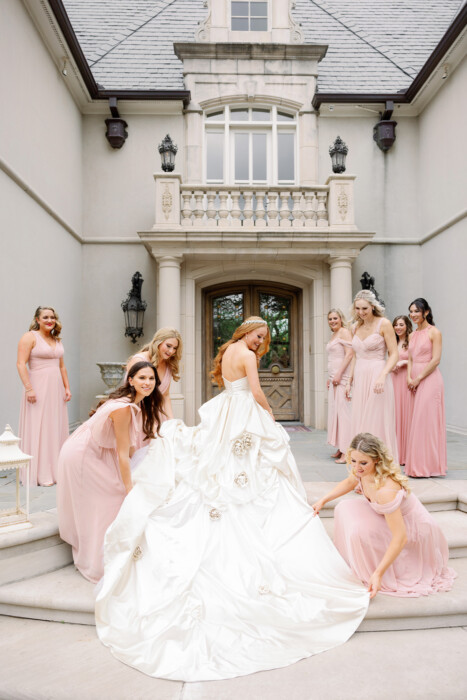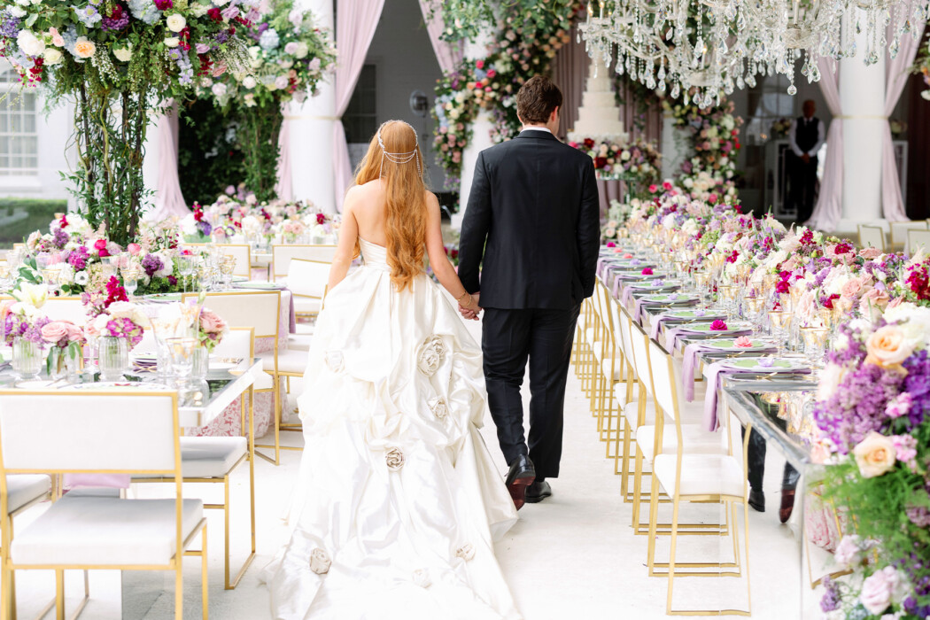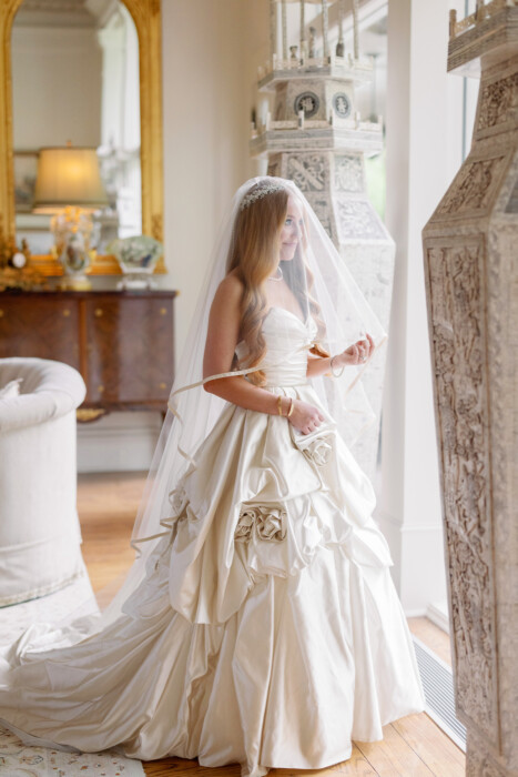 Ciara had seen a photo of this stunning Monique Lhuillier gown three months prior to getting engaged, but it was in pink, so she dismissed it. Consider it fate, then, when her Neiman’s sales representative showed her a picture of the same gown. Still not feeling the blush hue, Ciara had it custom made in a champagne-to-ivory ombre. “I fell in love with it,” she says.