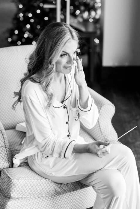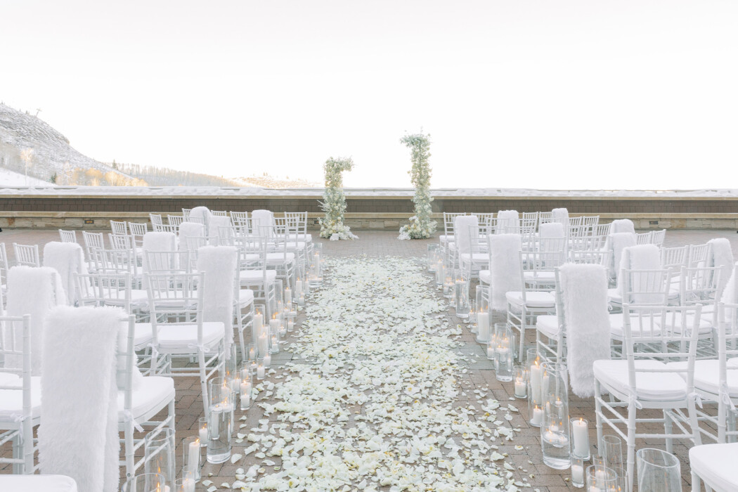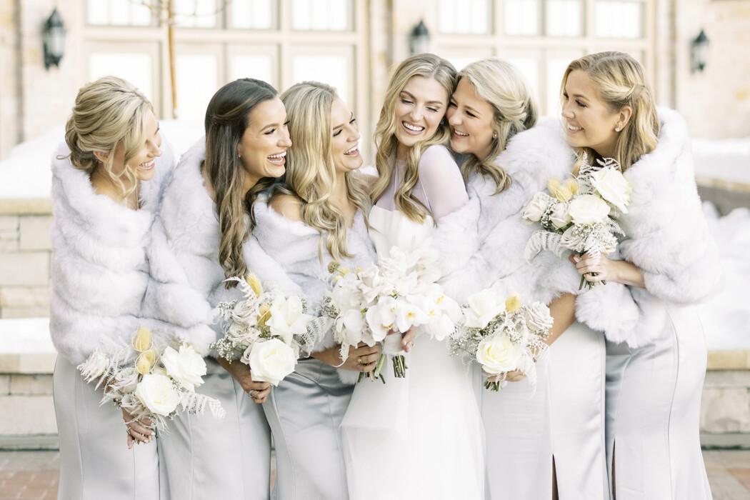 Falon and her bridesmaids spent the morning of the wedding enjoying hair and makeup services—a moment of much-needed pampering following the New Year’s Eve–themed rehearsal dinner the night before. The brides and her attendants all wore faux fur stoles to protect them from the chilly mountain air, while guests were treated to a hot cocoa and tea bar to keep warm during the outdoor ceremony.