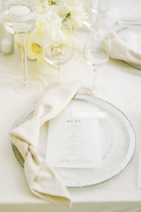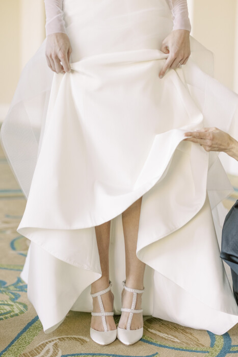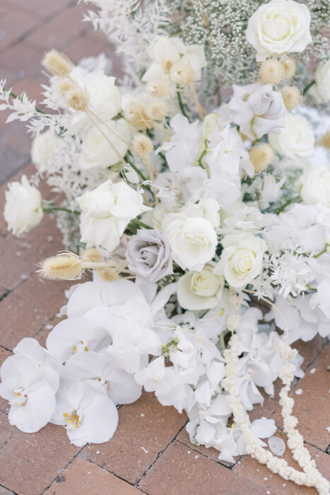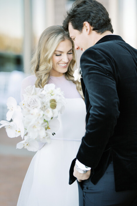 In our age of Instagrammable weddings and picture-perfect Pinterest boards, brides and planners alike can feel the pressure to conform to a certain standard. But planner Karli Spangler worked with bride Falon Miskelly to create a day that was uniquely suited to her. For Karli, this meant finding a way to keep a monochromatic look interesting. Many white weddings include lots of greenery, a detail of which Falon wasn’t a fan. Instead, she found ways to incorporate different materials and textures that stayed true to the color palette. For Falon, this meant including details that felt personal to her, and leaving out the ones that didn’t. During the planning process, she had a conversation with her mom about incorporating the something old, new, borrowed, and blue tradition. “We thought about it so hard, and just realized that we are not those people,” says Falon.